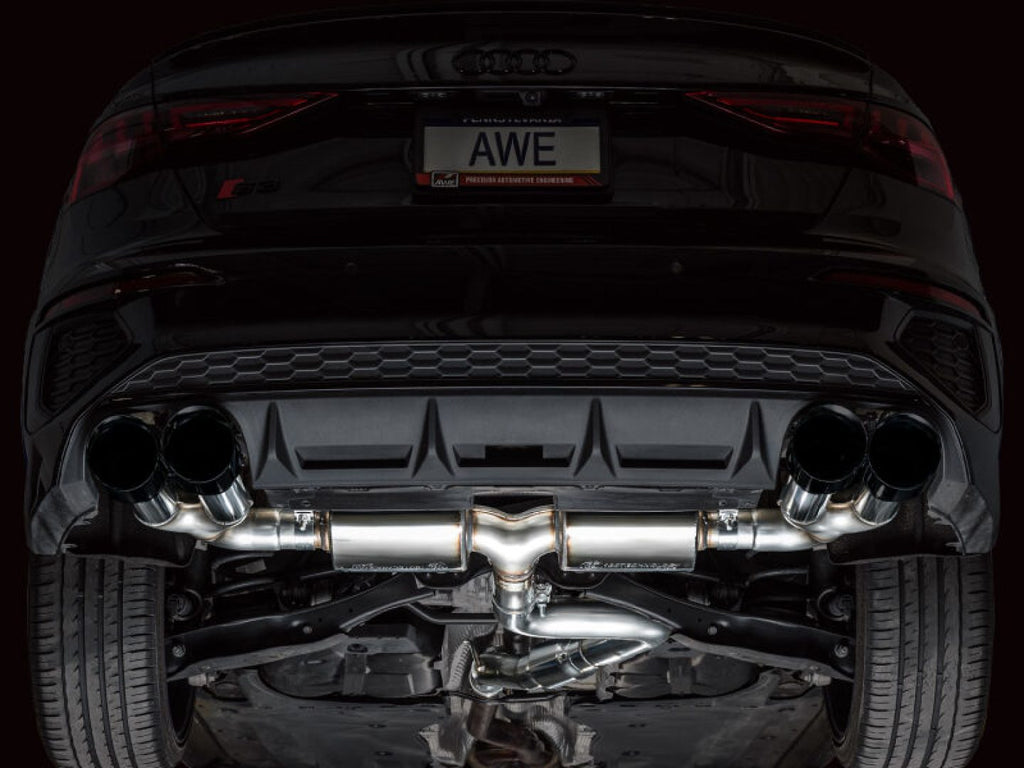 Introducing the first AWE Exhaust for the Audi S3 to ever feature patented drone-canceling 180 TechnologyÃâî. The Touring Edition features a 3âââ¬Ã inlet complete with an adapter to accommodate the factory downpipe perfectly while leaving an open 3âââ¬Ã connection. In the rear resides AWE's patented 180 TechnologyÃâî resonators responsible for maintaining straight-through performance while decimating drone-prone frequencies. Thanks to the design and construction of 180 TechnologyÃâî resonators, the internals will not break down and degrade over time causing tone change. Just full-bodied, drone-free rumble for life from the point of installation. This configuration provides the best ratio of interior refinement and exterior rumble on the market. No valves needed. Switch driving modes and the exhaust will render the same result as a vavled exhaust. It's the do-it-all exhaust for every day drivers. Comes complete with quad 4.5" slash-cut, double-walled tips in diamond black. The AWE Touring Edition for the 8Y S3 is made in the USA and backed by AWE's Fitment Guarantee, 50 state emissions compliance, No Check Engine Light Guarantee, and the AWE Lifetime Warranty.